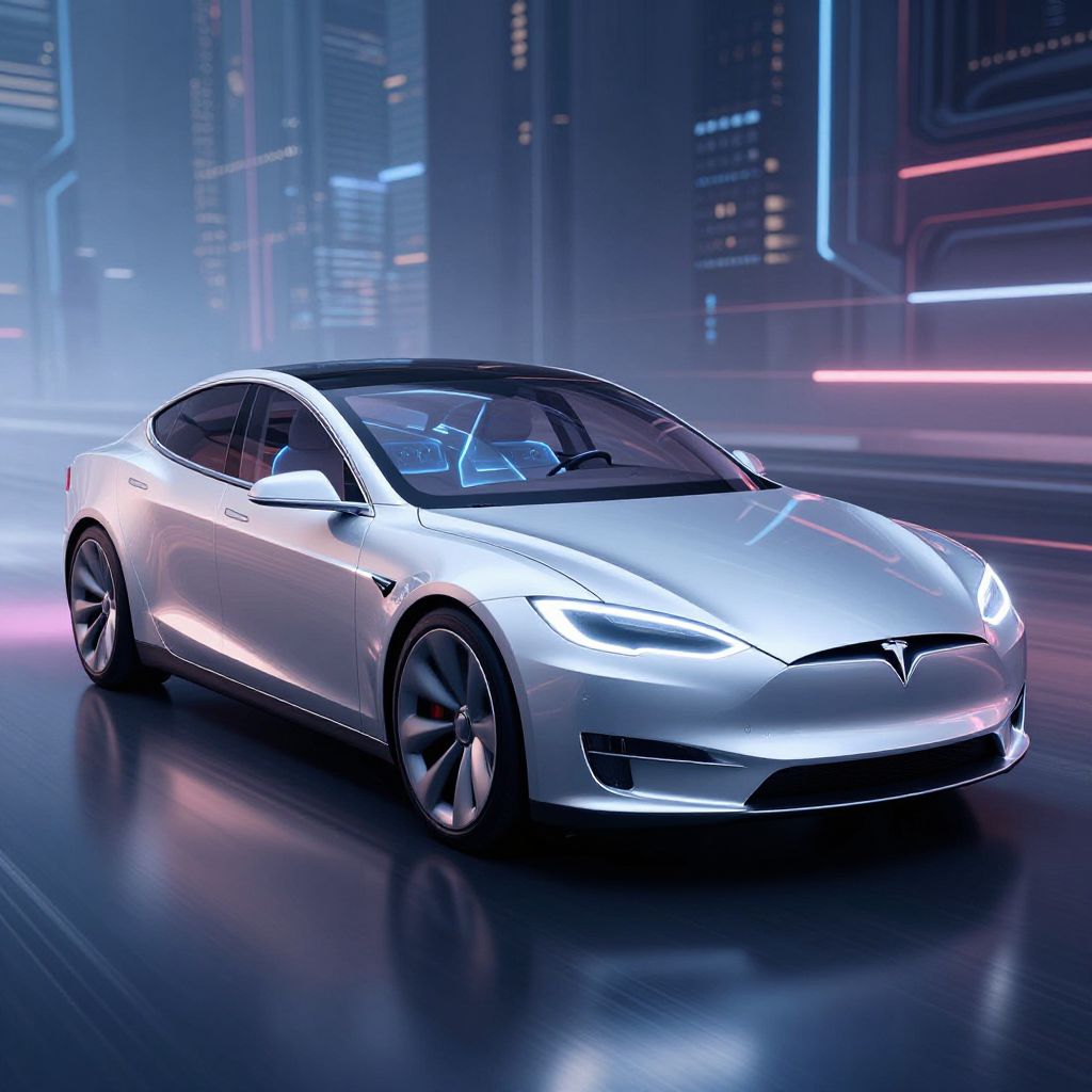 Marble Statue a insane fotorealistic petrol metallic tesla model s in a dark backyard, wet ground with reflections from the car, nice led-lighning, ultra high quality,