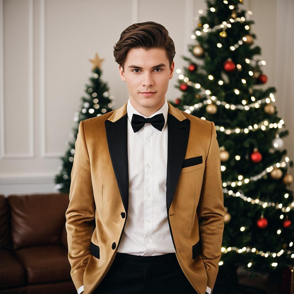 Christmas night out costume,1boy,male focus,hat,solo,santa hat,looking at viewer,white shirt,realistic,shirt,belt,christmas,jacket,red headwear,blurry,hand in pocket,blurry background,black jacket,open clothes,closed mouth,coat,long sleeves,short hair