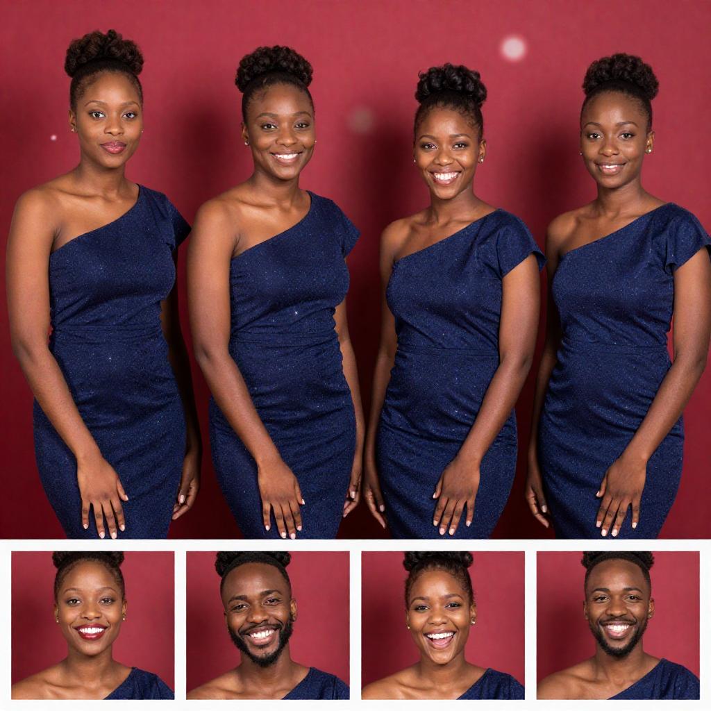 Photograph of four Black women with dark skin, wearing sparkly, dark blue, one-shoulder dresses, standing in a row on a red, starry background. Their hair is styled in high buns. Smiling and posing confidently. Insert of five close-up photos of a man and woman smiling and laughing. Red background with bokeh light effects.