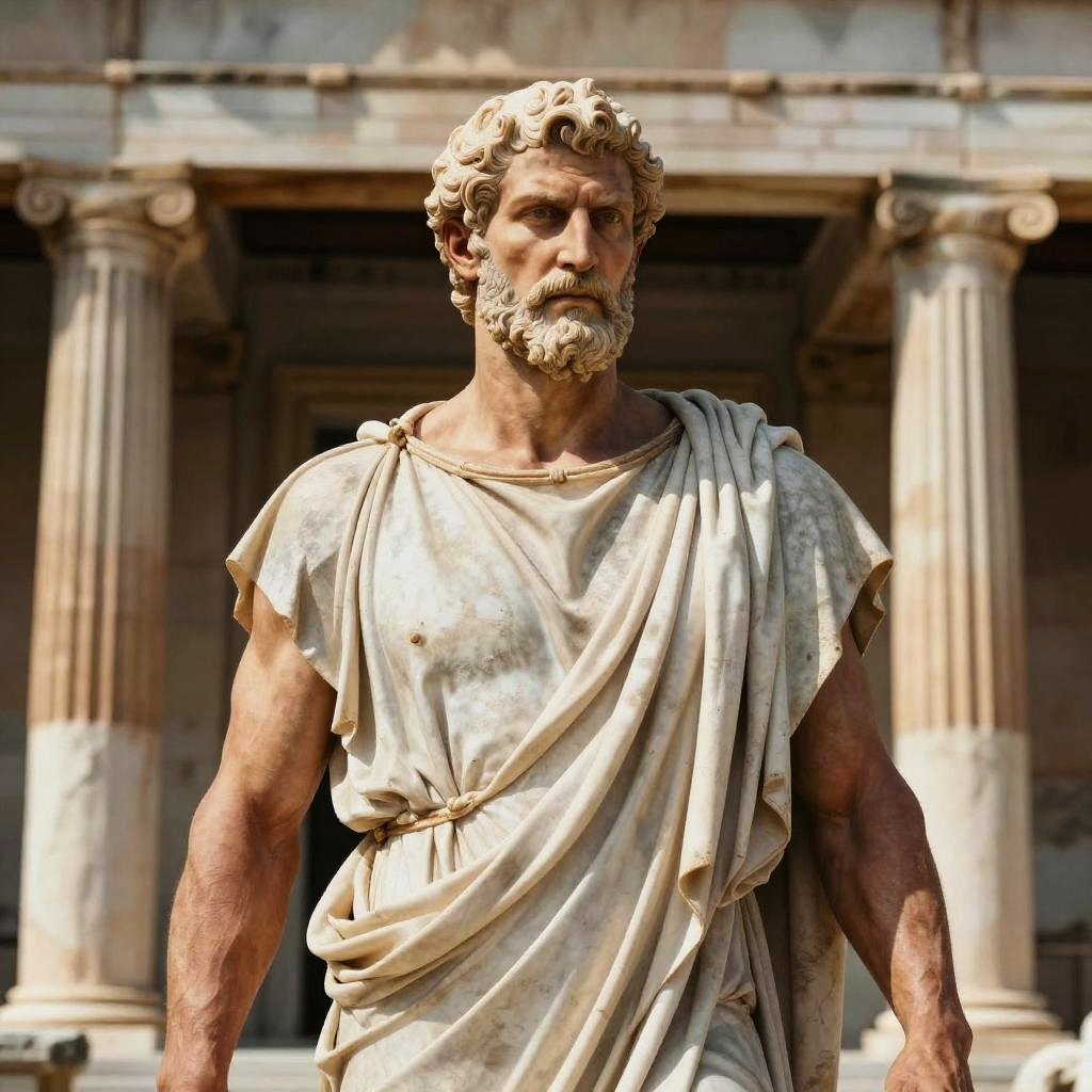 A photorealistic portrait of Greece personified as a scholarly philosopher with ancient ruins displayed behind him. He appears strong, muscular, and tall, captured with Sony A7R IV, F2.2, ISO125, 40mm. The lighting is volumetric, highlighting insane details to create a powerful, imposing look.