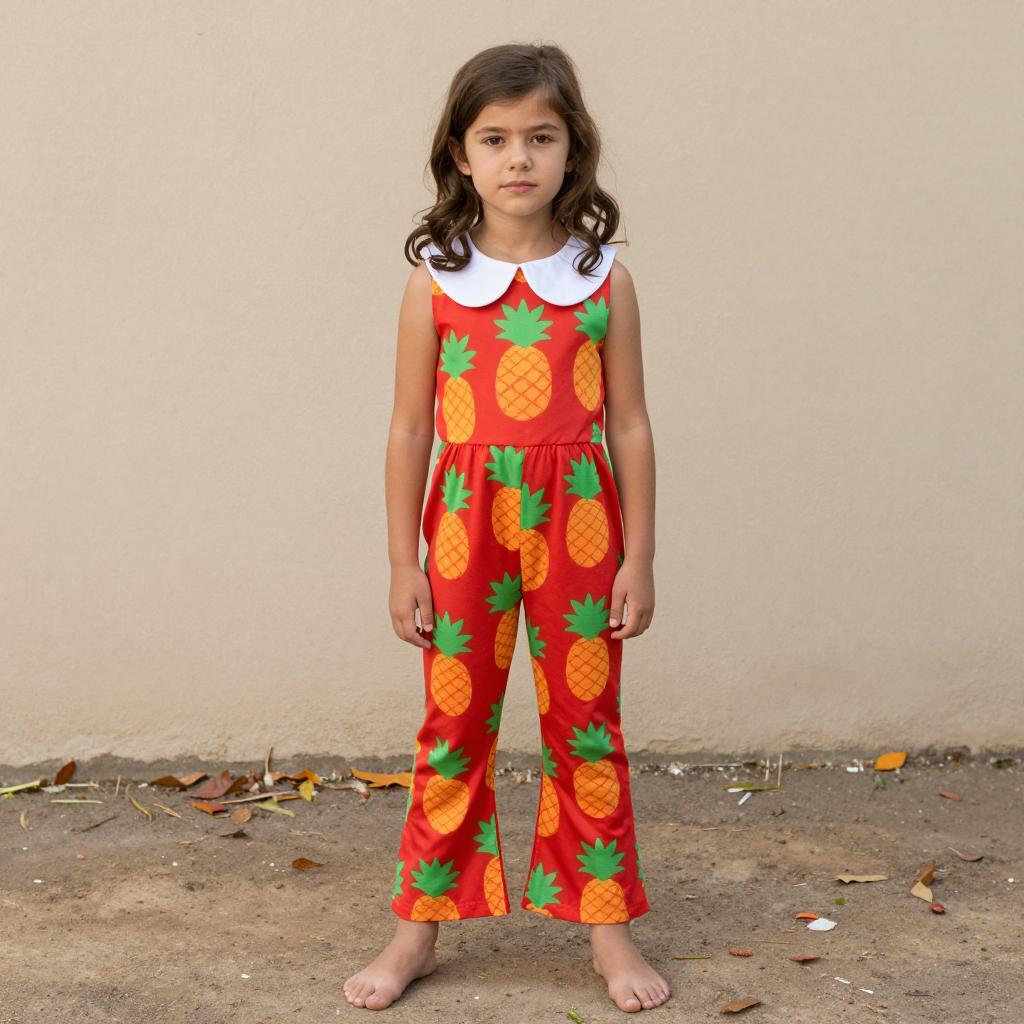 Portrait of a young girl standing barefoot on a dirt path, wearing a colorful retro-style 70s jumpsuit with a white Peter Pan collar and a vibrant red, green, and orange pineapple pattern. She has medium-length wavy brown hair and a neutral expression. The background features a plain beige wall with scattered leaves on the ground in a casual outdoor setting with natural daylight.