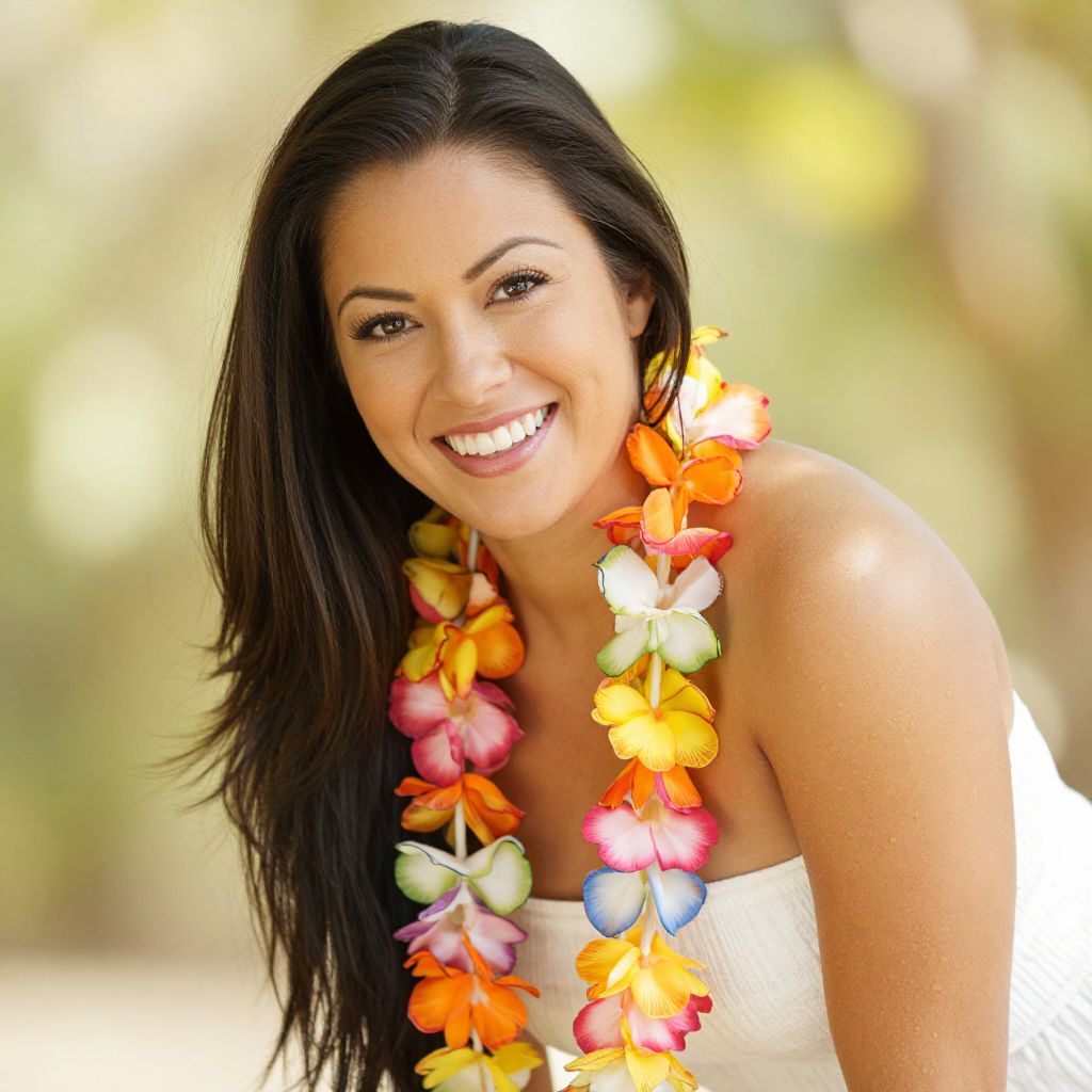 Photograph of a smiling, dark-haired woman with medium skin tone, wearing a colorful flower lei and white strapless top, against a blurred outdoor background