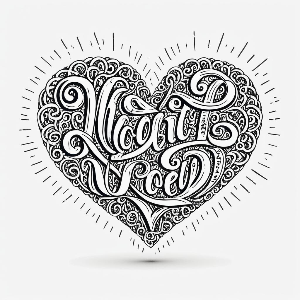 Detailed black and white illustration of a heart filled with intricate, whimsical ancient script lettering. The design features ornate curls and decorative flourishes, creating a joyful mood with crisp vector lines on a clean white background.