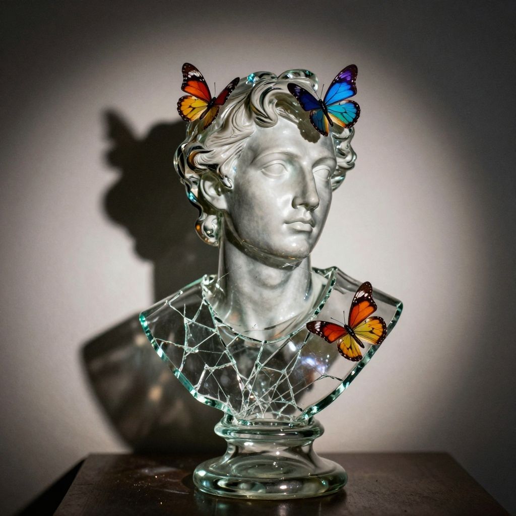 Photograph of a translucent, silver-colored bust of a classical-style male figure with wavy hair. The bust is illuminated from within, casting a soft glow and shadow on a plain, dark background. The figure's neck and shoulders are adorned with a pattern of glowing, crystal-like shards. Three vibrant butterflies, one orange with black spots, one blue, and one multicolored, rest delicately on the figure's head and shoulders, adding a striking contrast to the metallic and crystalline textures. The bust is placed on a dark wooden surface, enhancing the illuminated, ethereal effect.