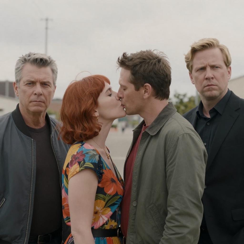 Photograph of four people standing closely. Center: man with short brown hair, green jacket, red shirt, kissing woman with short red hair, colorful floral top. Left: man with short gray hair, gray jacket, serious expression. Right: man with blond hair, black suit, stern expression. Background: urban, cloudy sky, power lines.