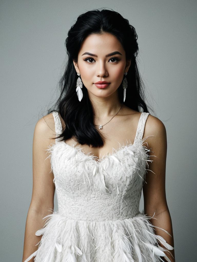 Portrait of an elegant Asian woman with long black hair wearing a white dress embellished with feathers. She has brown eyes, subtle makeup, and is accessorized with white feather earrings and a delicate necklace, against a plain grey background.
