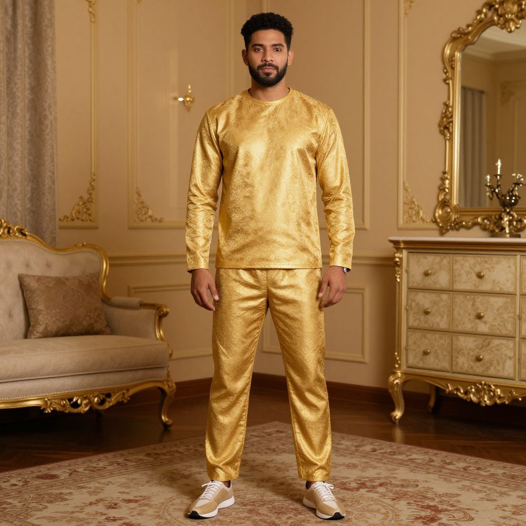 Photograph of a bearded man with dark skin and short black hair standing in an opulent room. He wears a shiny, gold embroidered long-sleeve tunic and matching gold pants, paired with white sneakers. The background features elegant, cream-colored walls with ornate gold trim, a gold-framed mirror, and a gold-finished dresser with candles. To the left is a plush, gold-accented armchair. The floor is wooden, and a patterned rug is partially visible. The man's confident stance and the luxurious setting create a regal atmosphere.