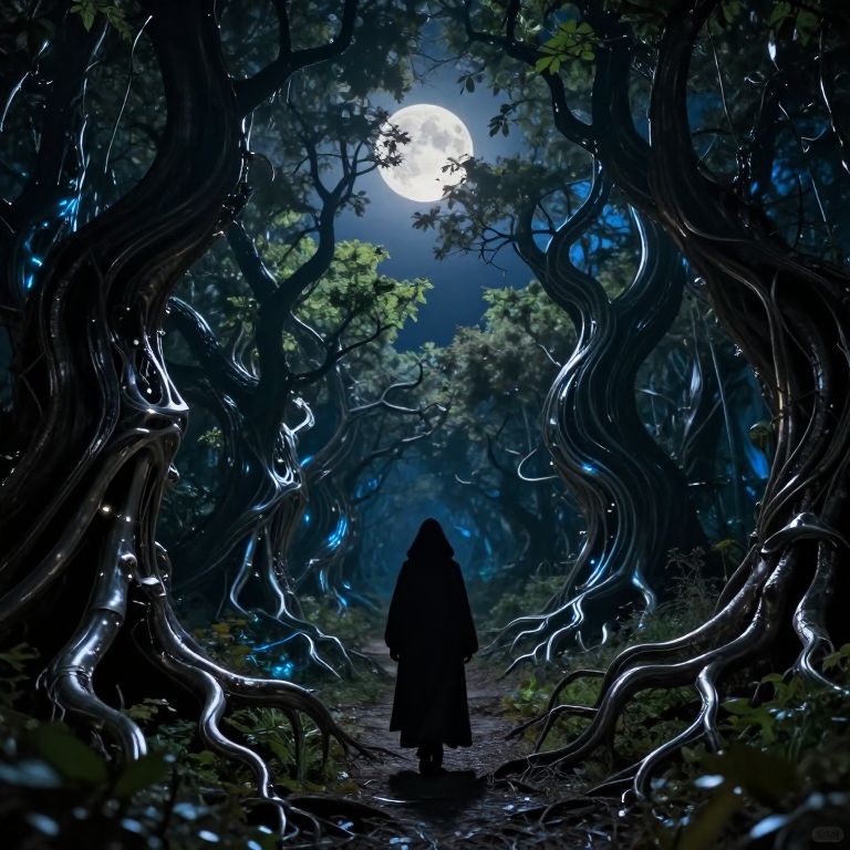 A tranquil night under the glow of a full moon in an enigmatic forest where nature's beauty has been reimagined with a blend of organic and metallic elements reminiscent of a surreal dreamscape. Twisted trees with roots that morph into sleek metal surfaces create a landscape that is both alien and captivating, as if sculpted by an artist who merges the natural world with machinery. A cloaked figure moves silently through this strange environment from an unusual perspective, their face hidden in shadow beneath their hood. The scene is illuminated by soft moonbeams filtering through the twisted foliage and eerie blue light emanating from the metallic flora, casting a mesmerizing yet unsettling atmosphere that invites both wonder and apprehension. This unique image portrays nature transformed into a beautiful and otherworldly biomechanical landscape, inviting viewers to explore its enigmatic beauty.