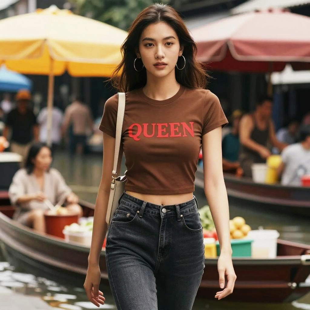 Photograph of an Asian woman with long, dark hair walking confidently through a bustling floating market. She wears a brown, short-sleeved, cropped t-shirt with "QUEEN" in red letters, and high-waisted, dark blue jeans. She carries a beige shoulder bag and has large, silver hoop earrings. The background features colorful umbrellas (yellow, orange, and red) over wooden boats filled with goods and people. The water reflects the market activity, and the overall scene is vibrant and lively, with a slightly blurred background adding depth to the image.