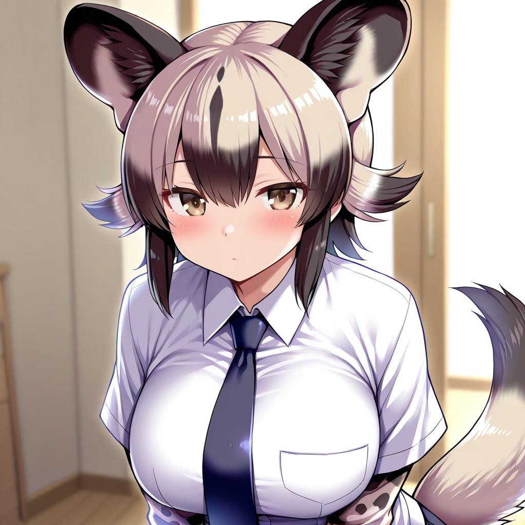 Digital illustration of an anthropomorphic female character with traits of an African wild dog. She has large dog ears, a bushy tail, and multicolored short hair in shades of black, brown, and grey. The character has brown eyes and is blushing softly. She is wearing a white short-sleeved shirt with a dark tie, standing indoors with a neutral expression.