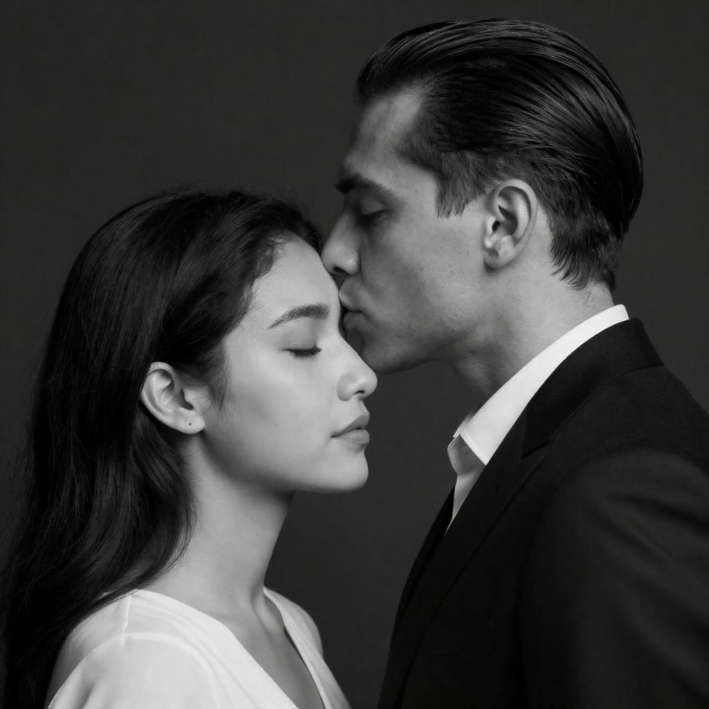 Black and white portrait of a man with slicked-back hair kissing the forehead of a woman with closed eyes. The man is wearing a dark suit with a white shirt, and the woman is wearing a light-colored top. The dark background emphasizes the gentle and tender moment between the two individuals.