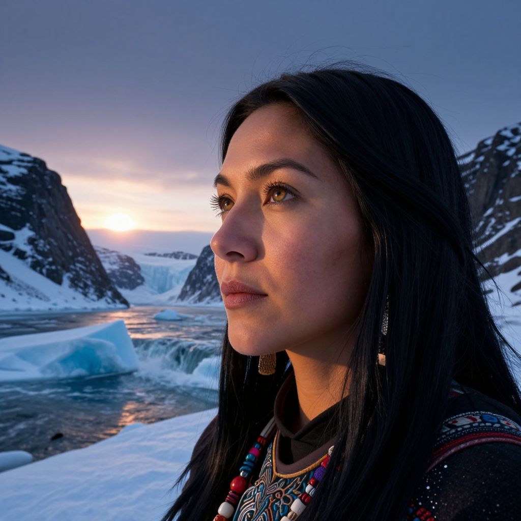 Envision a hyperrealistic portrait of a Native American woman, her piercing hazel eyes and silken raven hair illuminated by the ethereal Arctic midnight sun. From a low angle, her profile stands out against the dramatic frozen fjord, where icy waves crash on rugged cliffs. This captivating image evokes both awe for nature's raw beauty and admiration for her resilient spirit amidst untouched wilderness.
