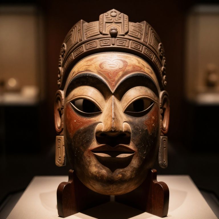 A close-up of a traditional mask used in a ceremonial ritual, intricately carved and painted, displayed on a wooden stand in a dimly lit cultural museum, with soft shadows highlighting its details.
