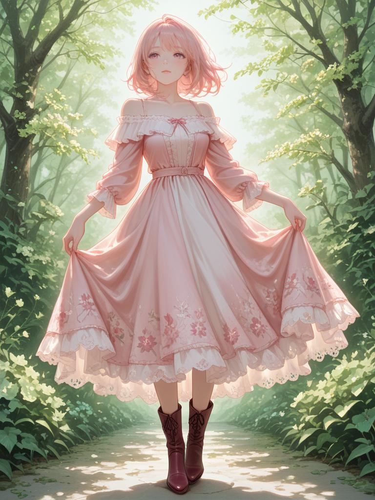 1girl, realistic face, Thigh-high burgundy suede boots, matte texture, rounded toe, A-line floral dress, lightweight chiffon material, pastel pink and green blossoms, off-shoulder neckline, ruffled hem, intricate lace trim, flowing silhouette, romantic and bohemian vibe.