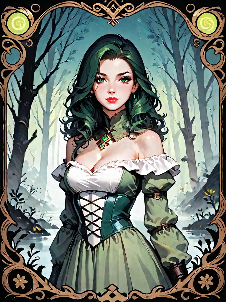 Illustration of a young woman wearing a pastel green A-line floral dress made of lightweight chiffon with an off-shoulder neckline, ruffled hem, and intricate lace trim. She has dark green flowing hair and wears a wide black corset belt and gold earrings. The background features a stylized arch design with soft glowing light and floral elements, enhancing the romantic and bohemian vibe of the image.