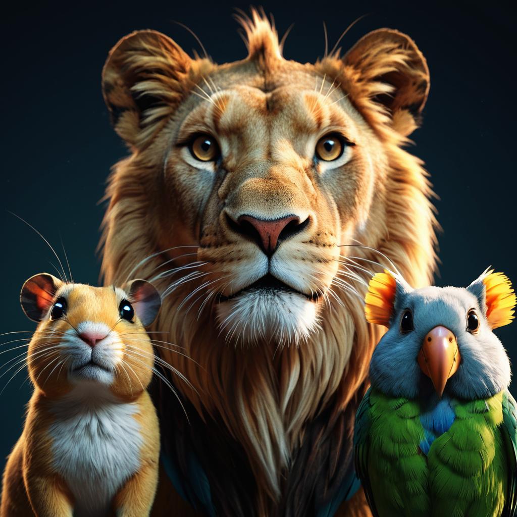 Translucent a cartoon portrait with three characters: a brave lioness, a small hamster, and a curious parrot. Portrait, chiaroscuro, holy cinematic lighting, 3D, C4D, blender, gradient background, octane rendering.