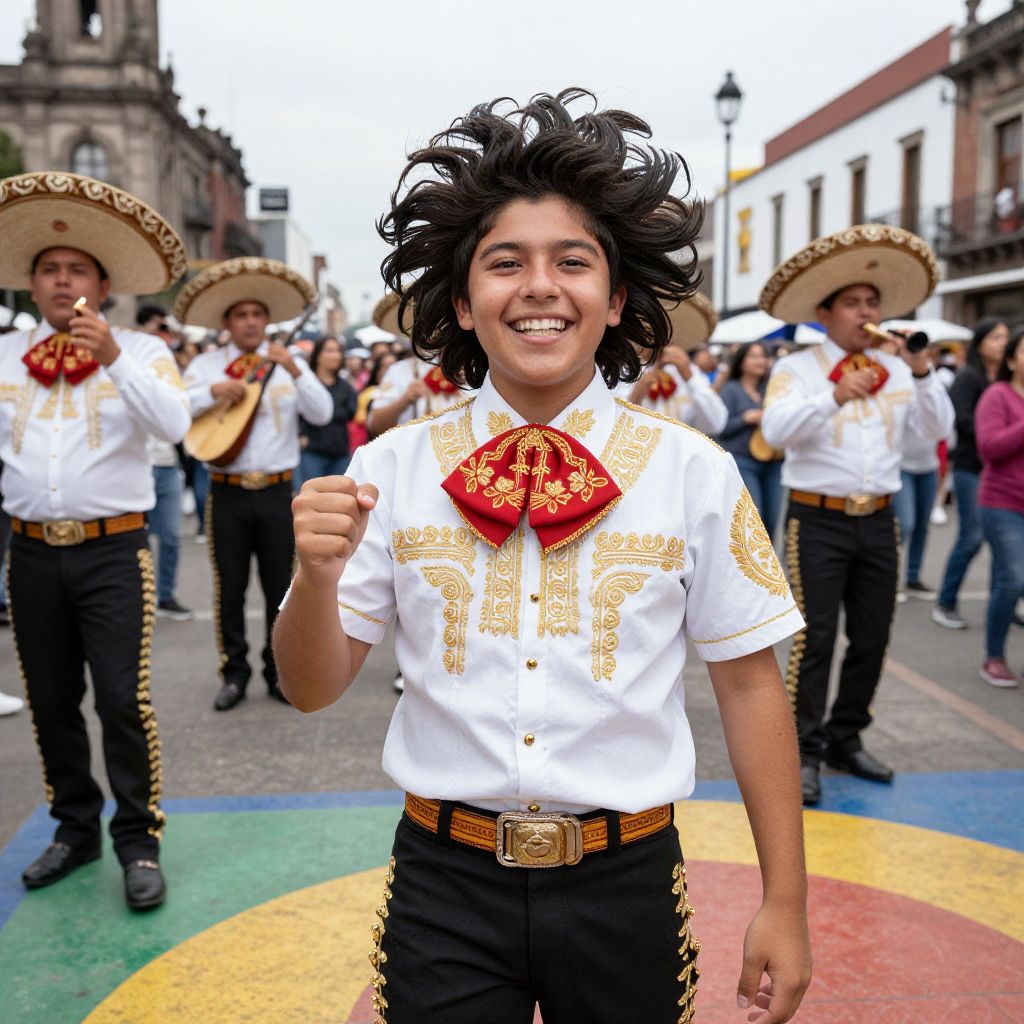 Photo of a lively teenager with a dynamic Mexican wave hairstyle, dressed in a festive Mexican costume with red and gold embroidery, standing on a colorful street in Mexico City's Zócalo, surrounded by mariachi music and joyful crowds, face glowing with pride and energy