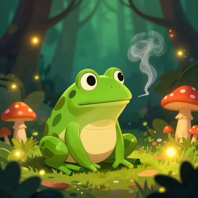 Frog character in a whimsical forest setting, wearing a tiny adventurer's outfit, vibrant colors, adorable and expressive, fantasy style, highly detailed background