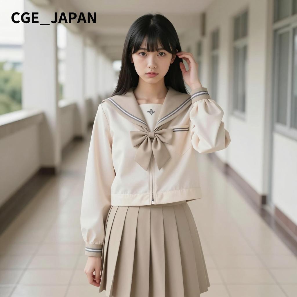 Asian woman with straight black hair, bangs, and light skin. Wearing a beige Japanese schoolgirl uniform with a large bow on the chest and a pleated skirt. Standing in a long, brightly lit hallway with light brown tiles. Right hand touching her hair. Neutral facial expression. "CGE_JAPAN" in top left corner.
