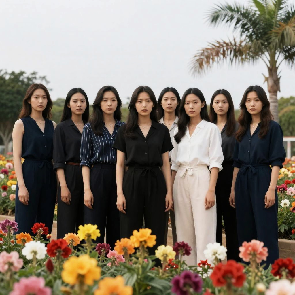 Group of seven Asian people in traditional black outfits with white accents, holding colorful ribbons. They are in a field of pink flowers under a bright blue sky. Rainbow-colored ribbons arc overhead. Woman in center with curly hair, smiling. Other people have short hair, serious expressions. Vivid colors, dynamic poses.