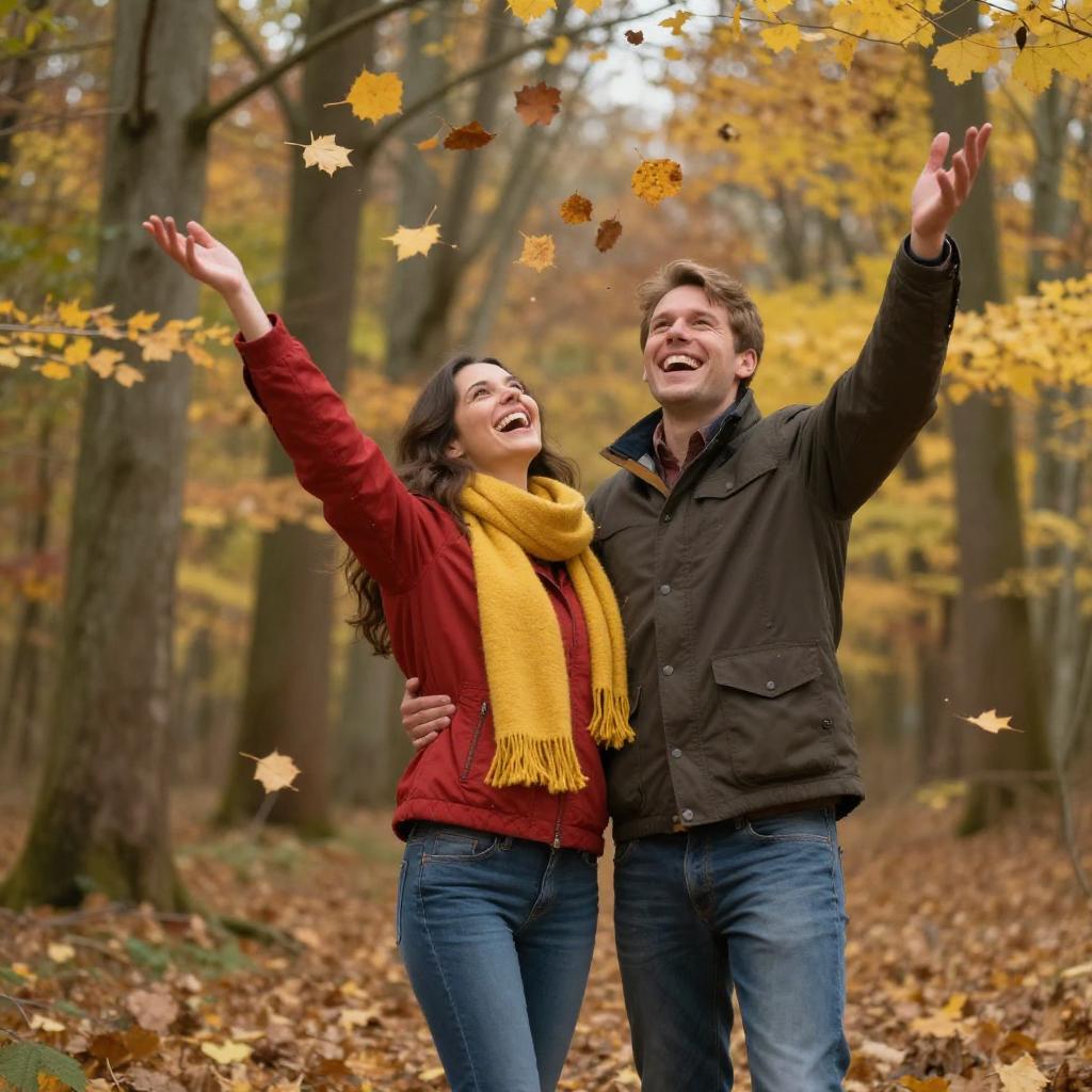 This photo shows a close-up, eye-level shot of a smiling couple clinking champagne glasses in front of a decorated Christmas tree. The woman, with curly blonde hair and a beaded necklace, faces the curly-haired man in a red and gray plaid sweater. The background is softly blurred, highlighting the warm, festive lighting and the couple's joyful expressions. The depth of field keeps the couple in sharp focus.