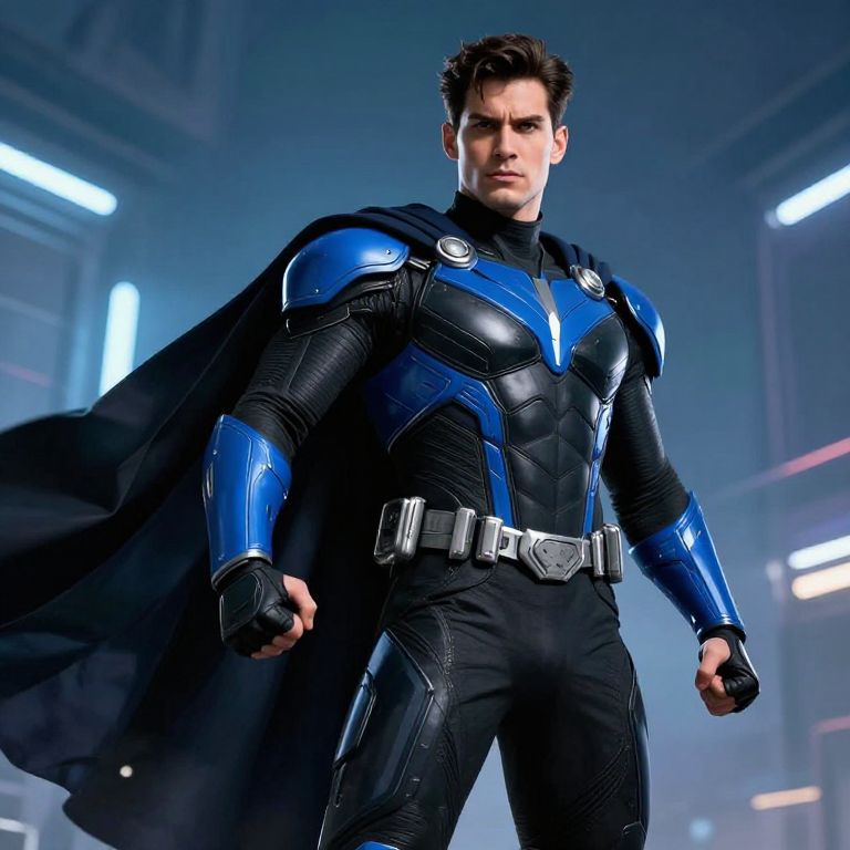 Photograph of a muscular, dark-haired male superhero in a blue and black armored suit with a black cape, standing confidently in a futuristic, brightly lit