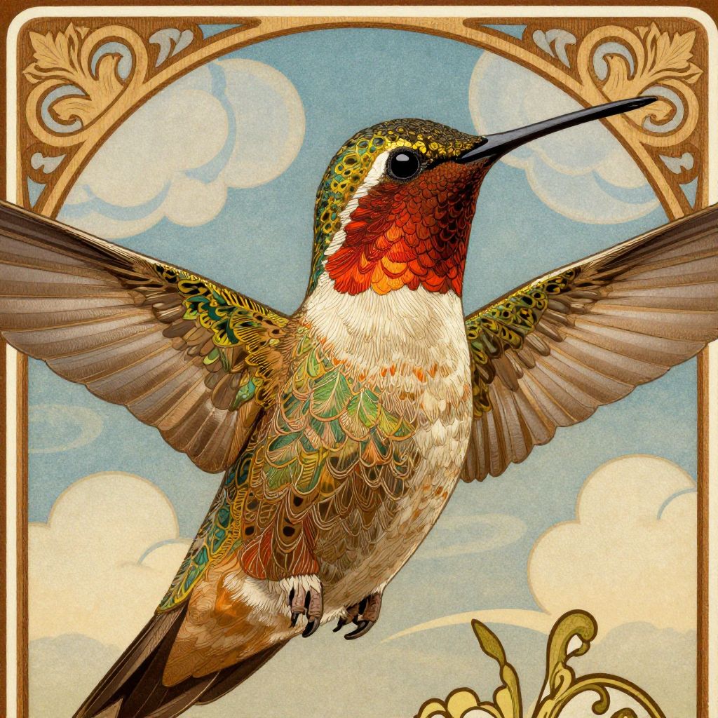 Detailed close-up illustration of a hummingbird featuring vibrant colors and intricate feather patterns, set against a decorative sky background with stylized clouds and ornate woodcut-inspired border. The artwork melds classic elegance and street art aesthetics, drawing inspiration from Alphonse Mucha's style.