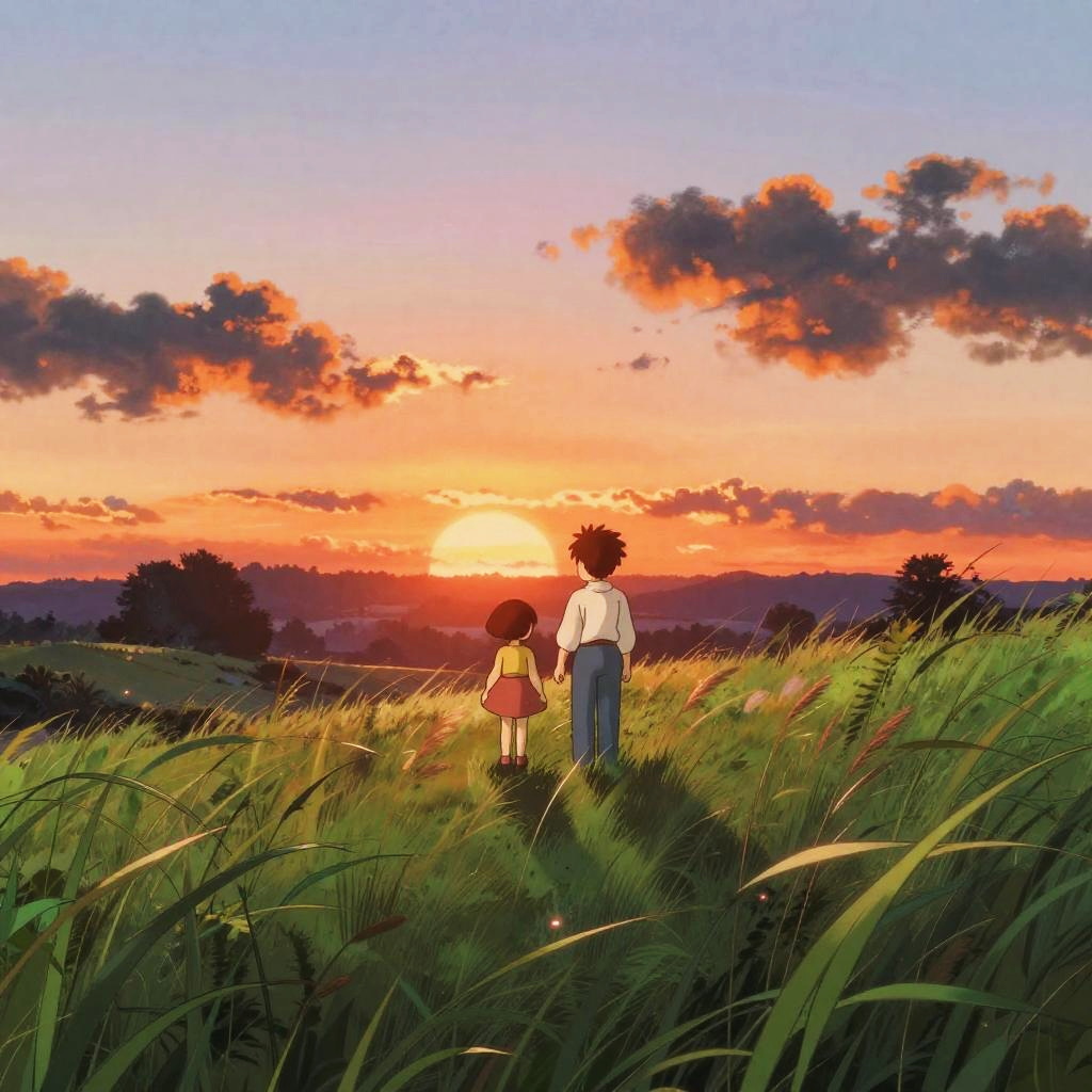 Studio ghibli sunset over a tranquil countryside with vibrant orange and pink hues, whimsical characters silhouetted against the sky, lush green fields swaying gently, cinematic lighting with a magical and nostalgic atmosphere, detailed animation style