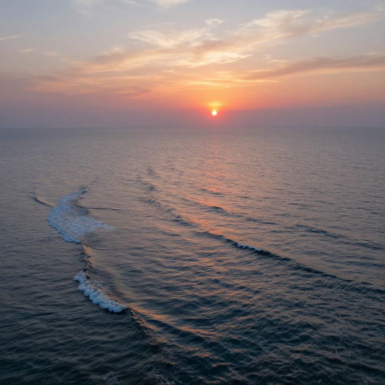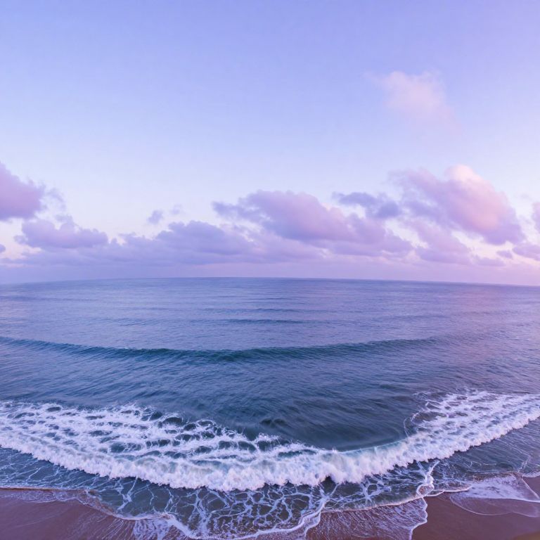 A dreamy seascape captures an idyllic ocean with waves gracefully caressing a shore, viewed from an elevated perspective akin to a fish-eye lens. Soft, muted hues of azure and lilac seamlessly blend with ethereal wisps of cloud-like formations that mirror the serenity of dawn's early light. This enchanting scene transitions fluidly from tranquil waters to tumultuous waves, evoking both peace and exhilaration in its ever-changing beauty, beckoning viewers on an imaginative voyage through nature's captivating allure.