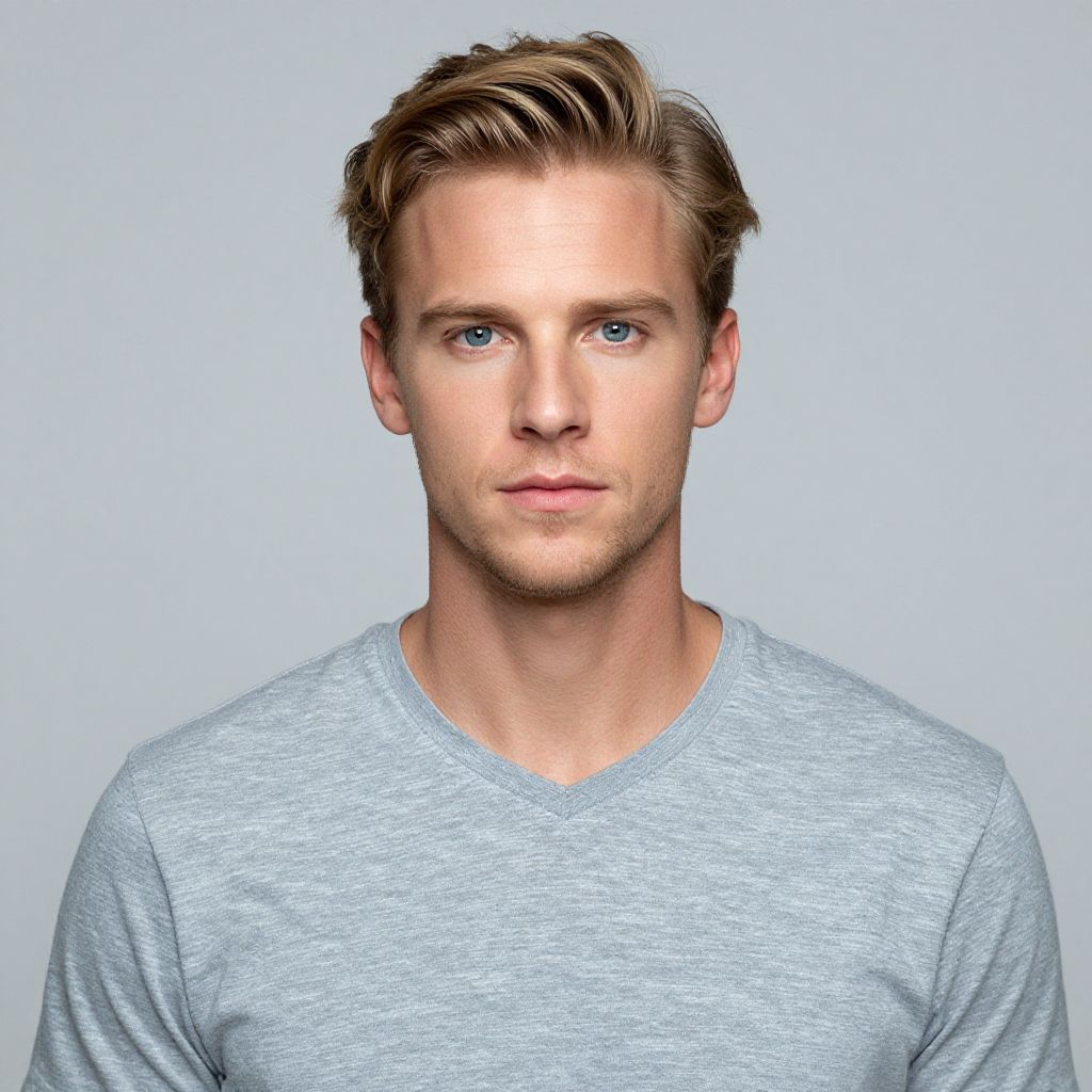 Photograph of a handsome, blue-eyed, light-skinned man with short, sandy blonde hair, wearing a light gray V-neck shirt, against a