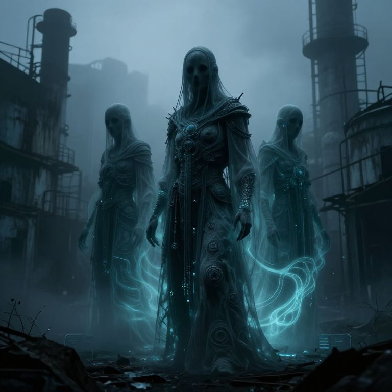 Ghostmix - a haunting fusion of ancient phantom figures intertwined with modern technological elements, set in a fog-covered abandoned industrial site, showcasing eerie luminescent auras with detailed textures and a moody, dark atmosphere.