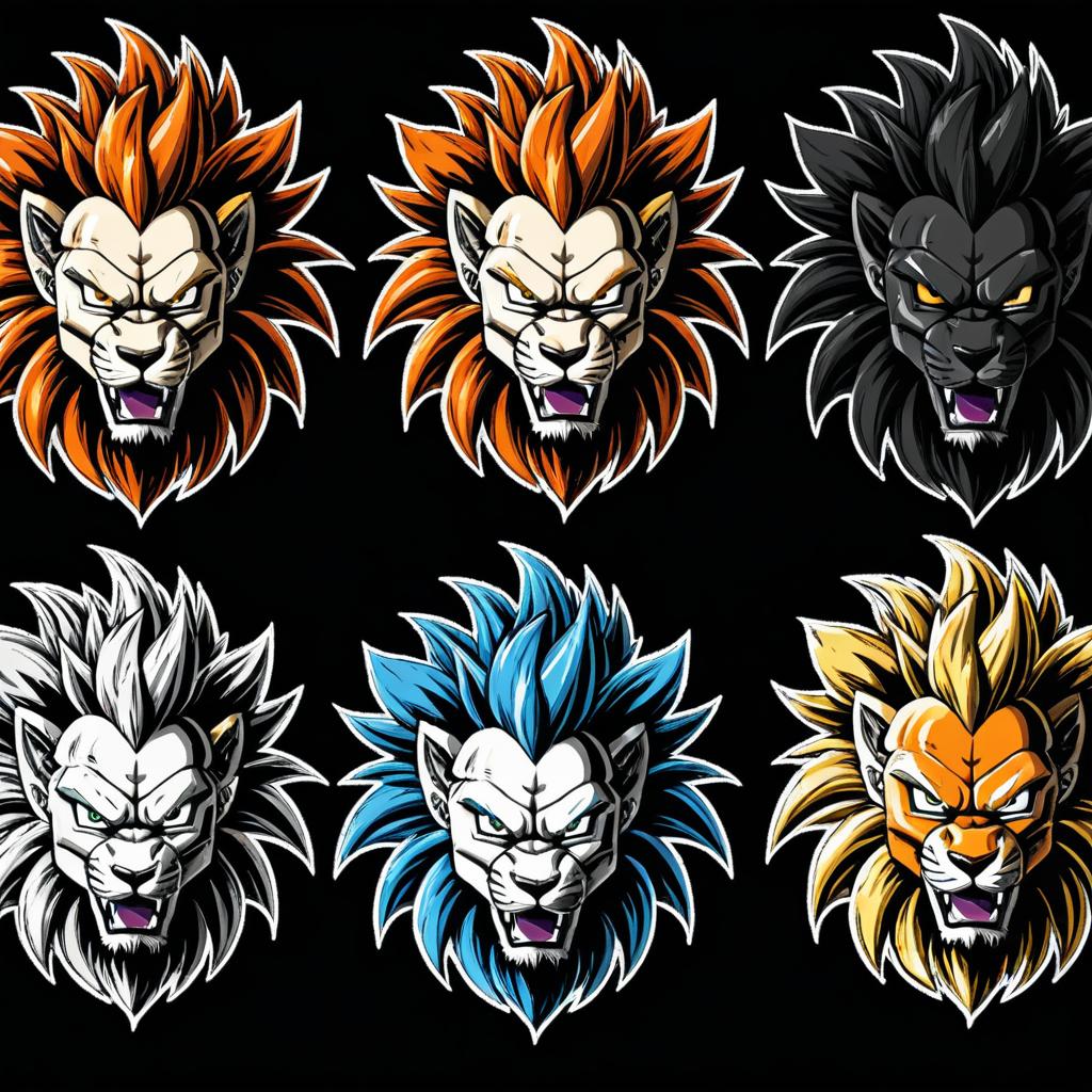 Collection of six unique, stylized lion head illustrations inspired by Dragon Ball Z animation style. Each lion features sharp, spiky manes in vibrant colors including orange, black, white, blue, and yellow, executed with cel shading and bold black ink outlines on a black background. The designs are flat 2D sprites with no gradients, suitable for game assets or animated projects.