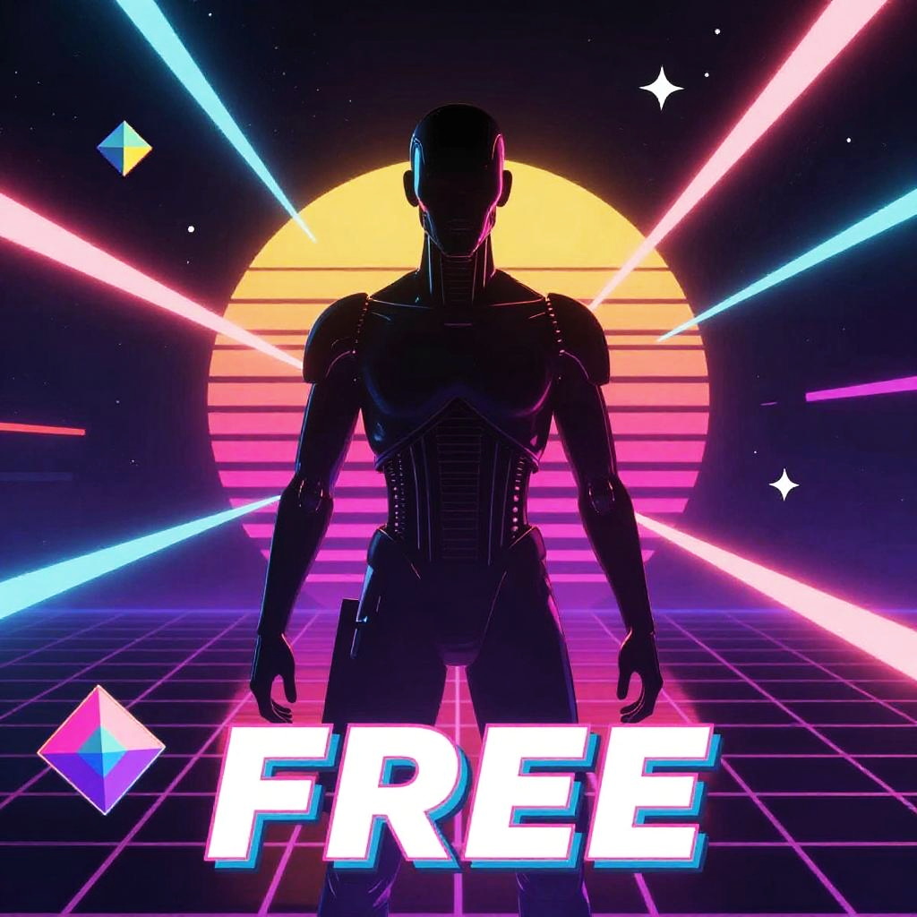 Free AI movie poster generator presenting a retro-futuristic style with neon grids and glowing geometric shapes, a silhouette of an AI entity in the center, with intense light beams and vibrant colors, combining 80s aesthetics with modern digital art techniques.