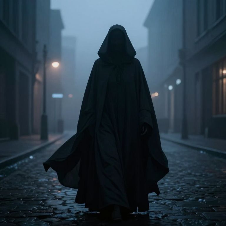 Silhouetted figure in a flowing, dark hooded cloak walks down a foggy, cobblestone street at dusk, illuminated by soft,