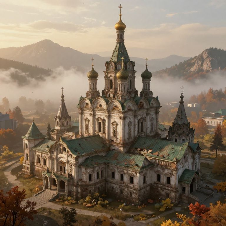 Vulnerable huge sprawling Russian orthodox monastery in mountains, derelict buildings, autumn, mists, golden hour, highly detailed:: video game concept art,