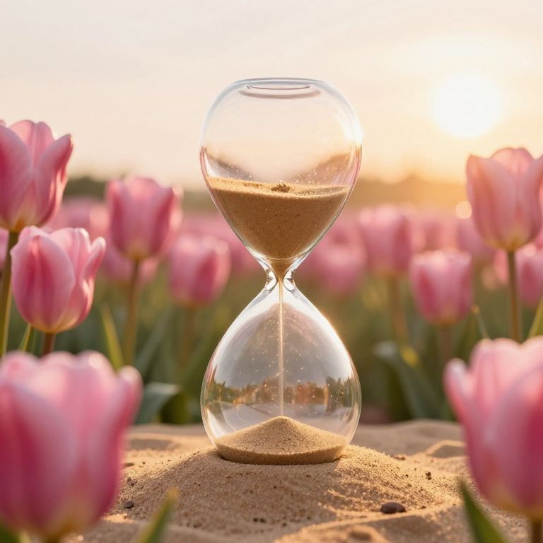 Golden sand cascades through transparent hourglasses suspended amidst a vibrant field of pink tulips, their delicate petals bathed in the warm glow of a setting sun.