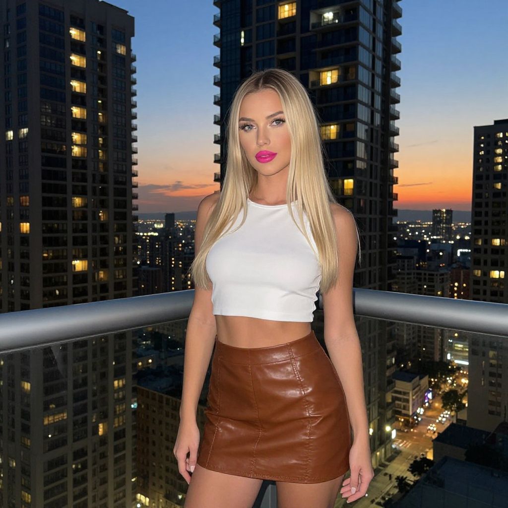 Photograph of a blonde woman with long, straight hair, wearing a white, sleeveless crop top and a brown leather mini-skirt. She has pink lipstick and a confident expression. She stands on a balcony at dusk, with the city skyline featuring tall buildings and illuminated windows in the background. The sky transitions from orange to dark blue. Her skin is fair, and she has a toned physique. The balcony railing is visible on the lower right, and the city lights create a vibrant contrast against the twilight sky.