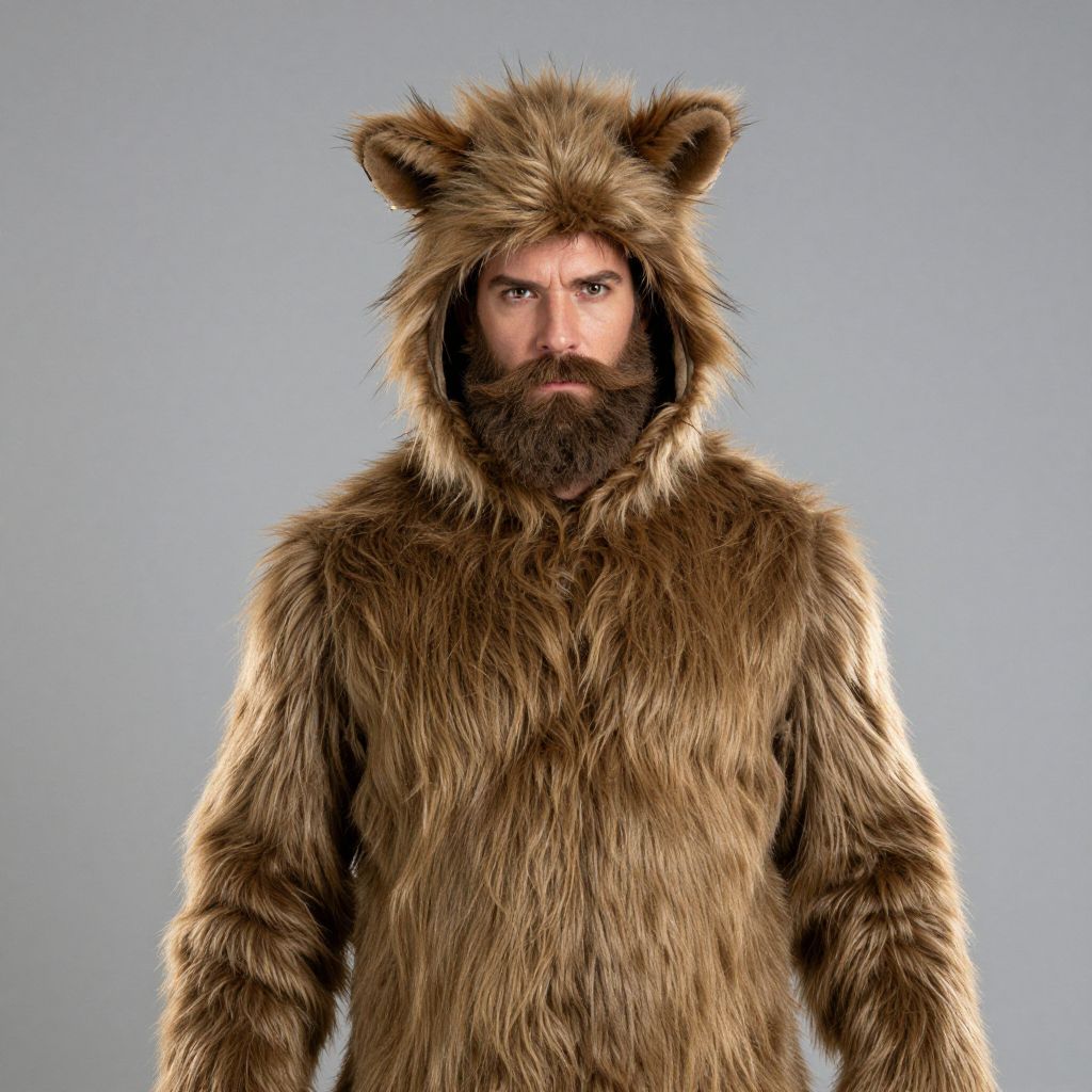 Sabretooth Costume, man in a furry costume with a beard and a furry hat