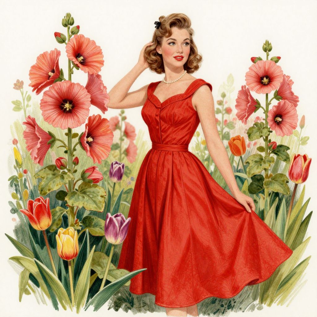 A vintage-inspired illustration reminiscent of 1950s Vogue photography, featuring a woman in a flowing red dress amidst vibrant hollyhocks and tulips, rendered in a detailed, hand-drawn style with soft, natural lighting effects.