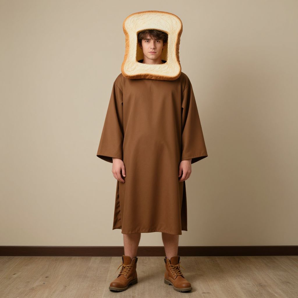 "bread costume, solo, 1boy, male focus, hood, standing, full body, robe, brown footwear Realistic photo of casual sexy person with pretty face"