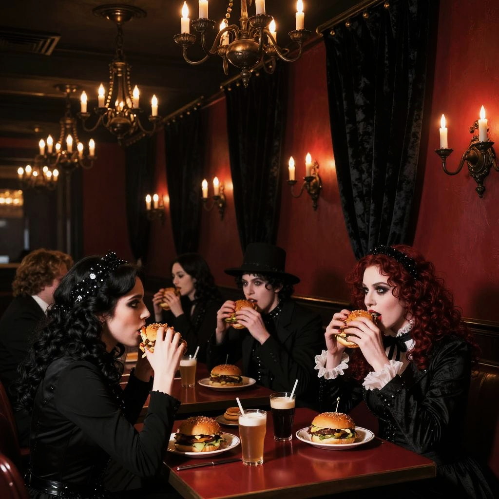Interior of Goth Wendy's, dim candlelight, black velvet curtains, patrons in gothic fashion enjoying burgers, dark red and black color scheme, vintage chandeliers, mysterious shadows