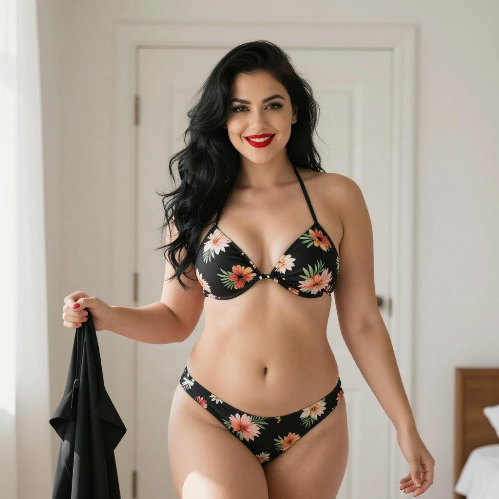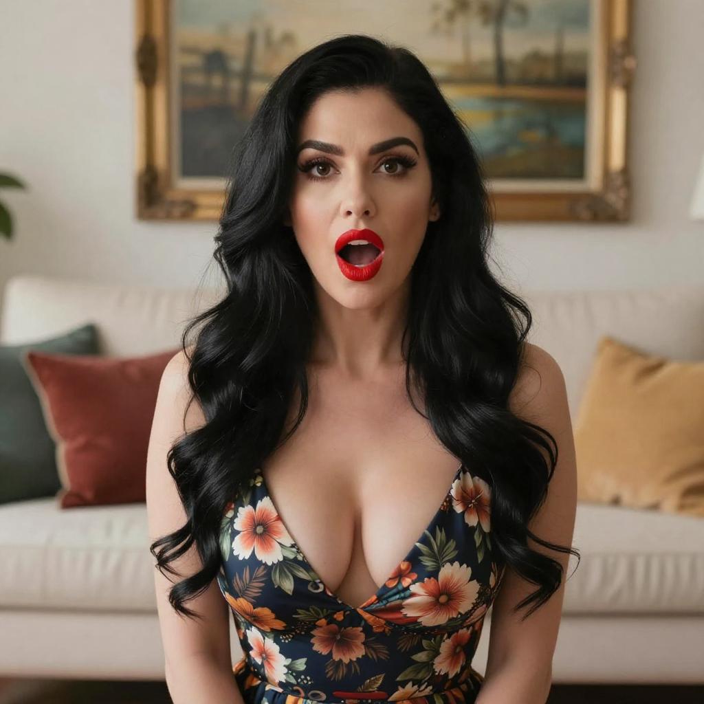 Photograph of a fair-skinned woman with long, wavy black hair, wearing a low-cut, floral-patterned dress that reveals ample cleavage. She has red lipstick and an open-mouthed, surprised expression. She is seated in a living room with a white couch, colorful pillows, and a framed painting on the wall in the background.