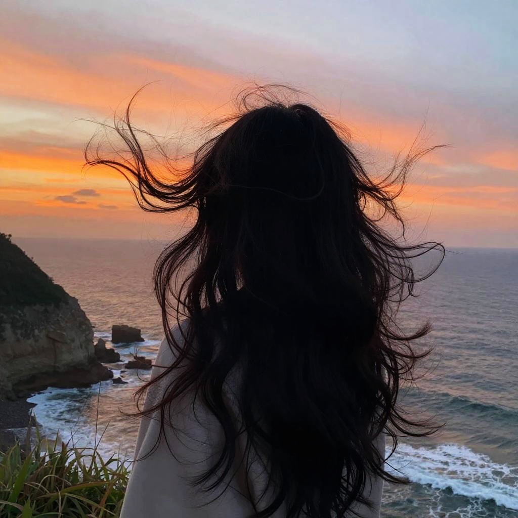 Black long wavy hair blowing in the wind on a coastal cliff at sunset, vibrant orange and pink sky in the background, natural waves emphasize freedom and wild beauty, detailed hair texture with interplay of light and shadow, cinematic wide angle view