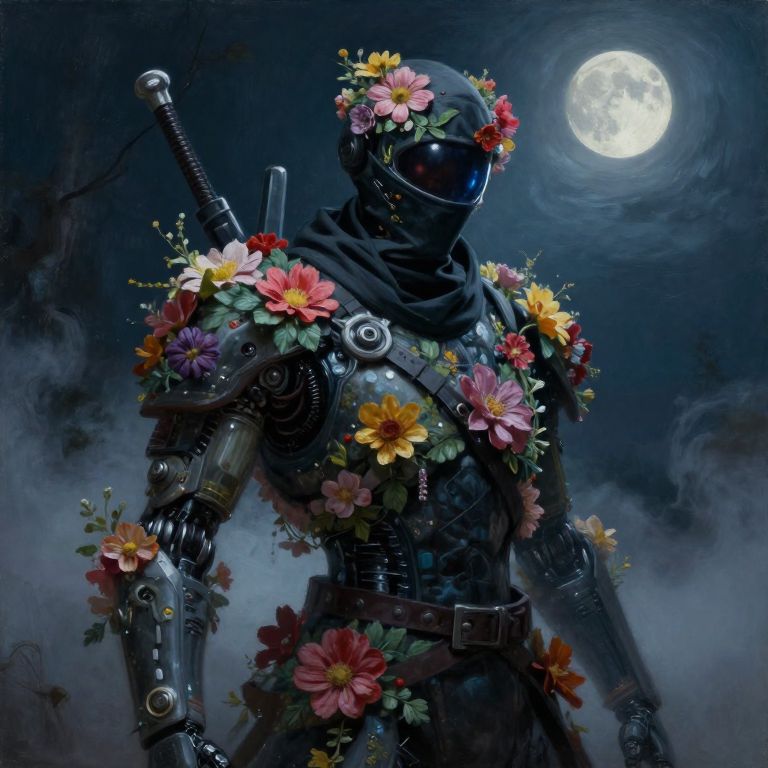 Hyper realistic oil painting of a cybernetic ninja covered in flowers, futuristic, fog, volumetric lighting, nighttime, moonlight, creepy, by greg rutkowski
