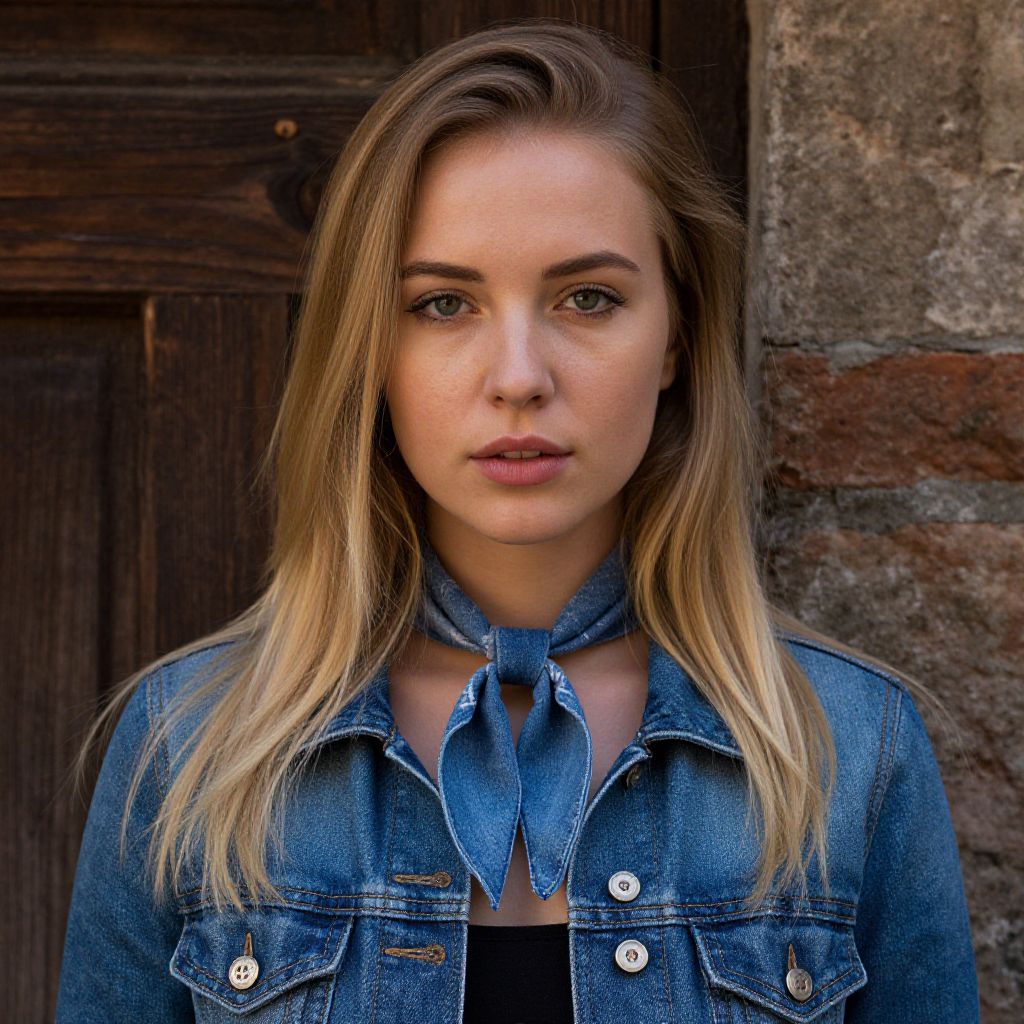 Photograph of a young Caucasian woman with fair skin and blonde hair, parted in the middle, wearing a blue denim jacket with white buttons and a matching denim scarf tied around her neck. She has blue eyes, subtle makeup, and a neutral expression. The background features a rustic, weathered wooden door and a brick wall. The lighting is natural, highlighting the texture of the denim and the roughness of the background elements. The overall style is casual and contemporary.
