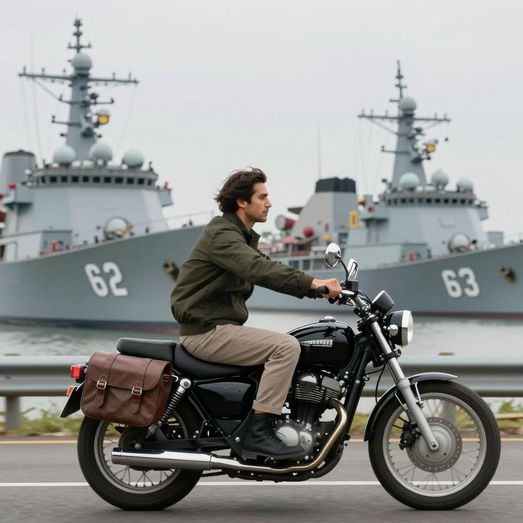 Three men on motorcycles racing on a road. Front man wears white shirt, black pants, blue helmet with white stars, brown boots, riding a chopper with American flag decals. Middle man in brown jacket, sunglasses, brown hat, riding a similar chopper. Rear man in beige jacket, blonde helmet, brown boots, carrying a brown bag on the back. Background: grassy field, trees, blue sky.