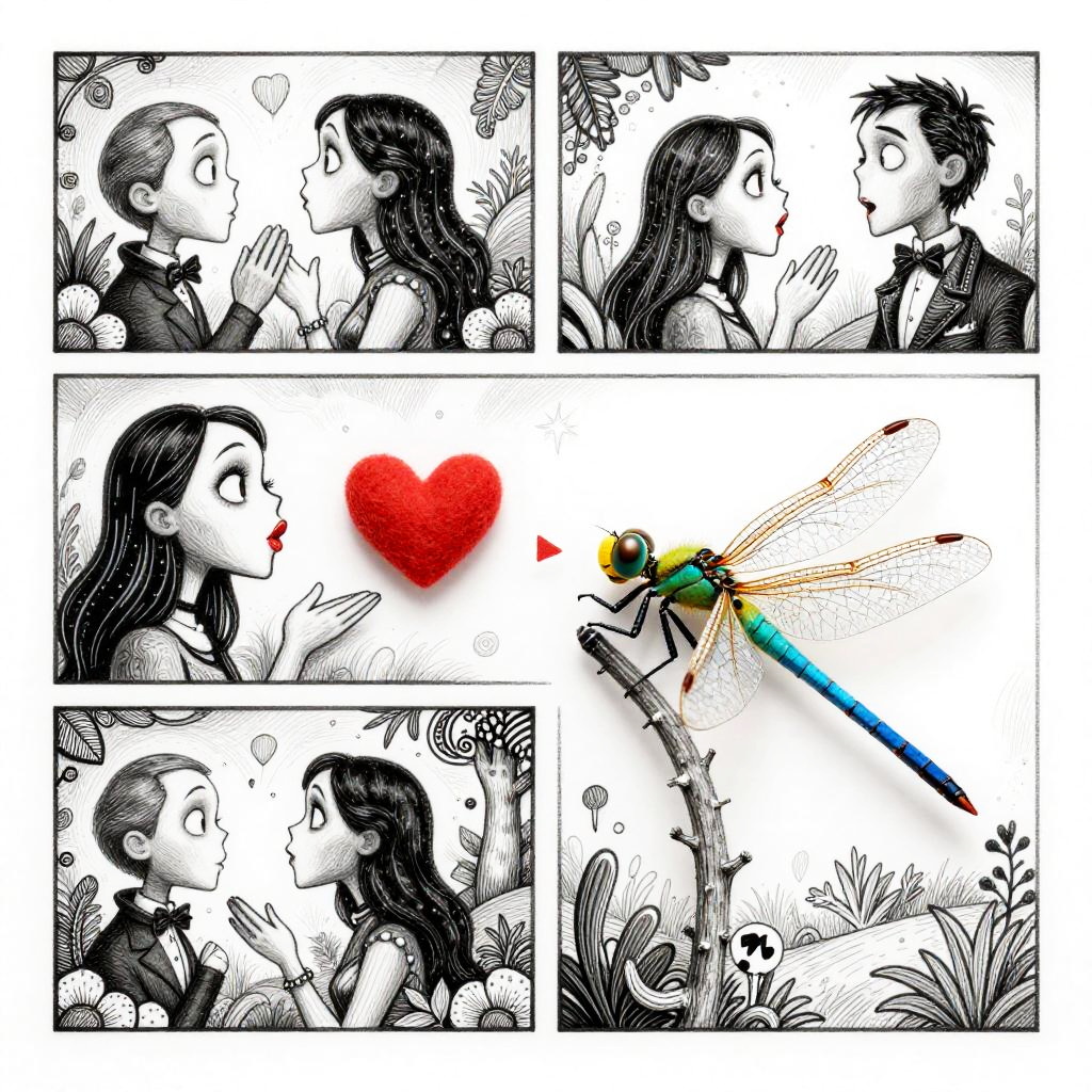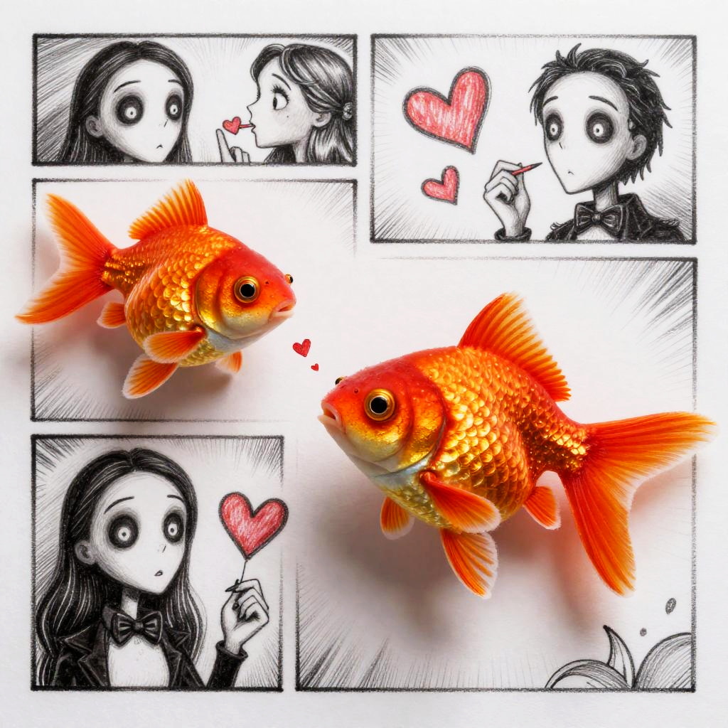 A funny comic cartoon lemur in the style of Tim Burton in a mixed style of watercolor + ink, sending kisses and love to everyone. Super-detailed image with photorealism and sketching effect. Interesting 3D doodling jungle patterns