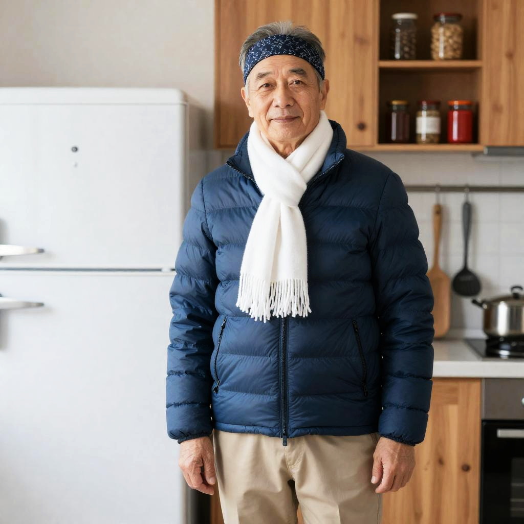 Middle-aged man with white hard hat, dark green jacket, and beige shirt, giving a thumbs-up. Industrial setting with gray walls, metal panel, green door frame, and yellow caution sign. Background includes pipes and industrial equipment. Man has light skin and glasses, standing slightly to the right.