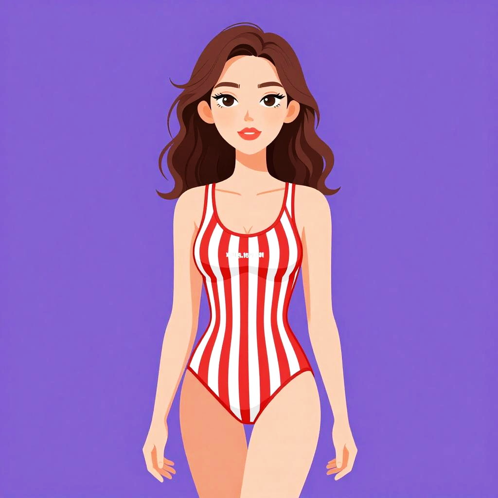 Woman with pretty face and pretty hair. Woman, sporty beachwear, red and white vertical striped one-piece swimsuit, scoop neckline, thin straps, white text across the chest, high-cut leg, photo studio background --sref 1461