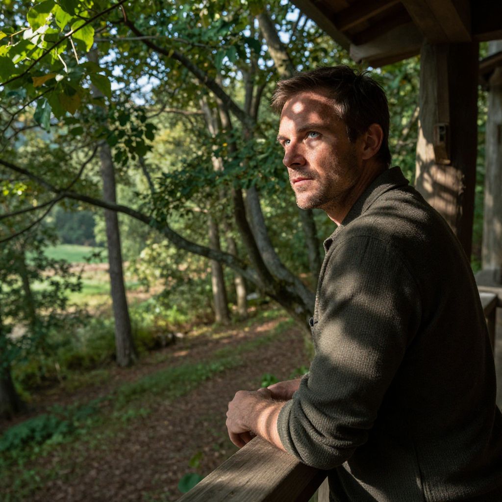 Photograph of a middle-aged man with short, dark brown hair and light stubble, sitting on a wooden porch. He wears a dark, textured sweater and looks over his shoulder with a serious expression. Sunlight filters through the dense, green foliage of the forest, casting dappled shadows on his face and the wooden porch. The background reveals a sunlit forest clearing with tall trees and a dirt path. The image has a high-contrast, almost painterly style, emphasizing the interplay of light and shadow.
